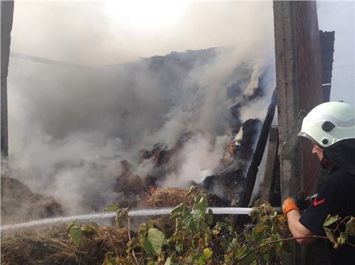 Karacabey’in Akhisar Mahallesi'nde Mahmut B’ye ait hayvan damına akşam saatlerinde yıldırım düştü. Yıldırım düşmesinin ardından samanlıkta yangın çıktı. Yangın rüzgarında etkisiyle kısa sürede büyüdü.