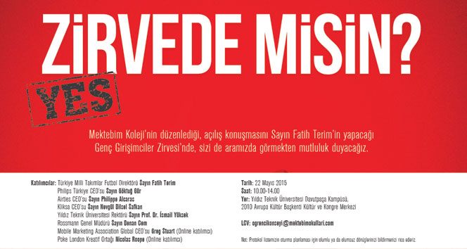 Yıldız Teknik Üniversitesi Davutpaşa Kampüsü Kongre Merkezi'nde yarın saat 10.00'da başlayacak olan Genç Girişimciler Zirvesi, öğrencilere girişimcilik ruhunu aşılamayı hedefliyor. Mektebim Koleji'nin ilk kez düzenlediği bu etkinlikte, Türkiye Milli Takımlar Futbol Direktörü Fatih Terim'in yanı sıra, birçok başarılı marka CEO'su da yer alacak. Zirve'de, Philips Türkiye CEO'su Göktuğ Gür, Airties CEO'su Philippe Alcaras, TEB Girişim Bankacılığı Pazarlama Müdürü İbrahim Coşkuner ve diğer önemli isimler konuşmacı olarak katılacak.