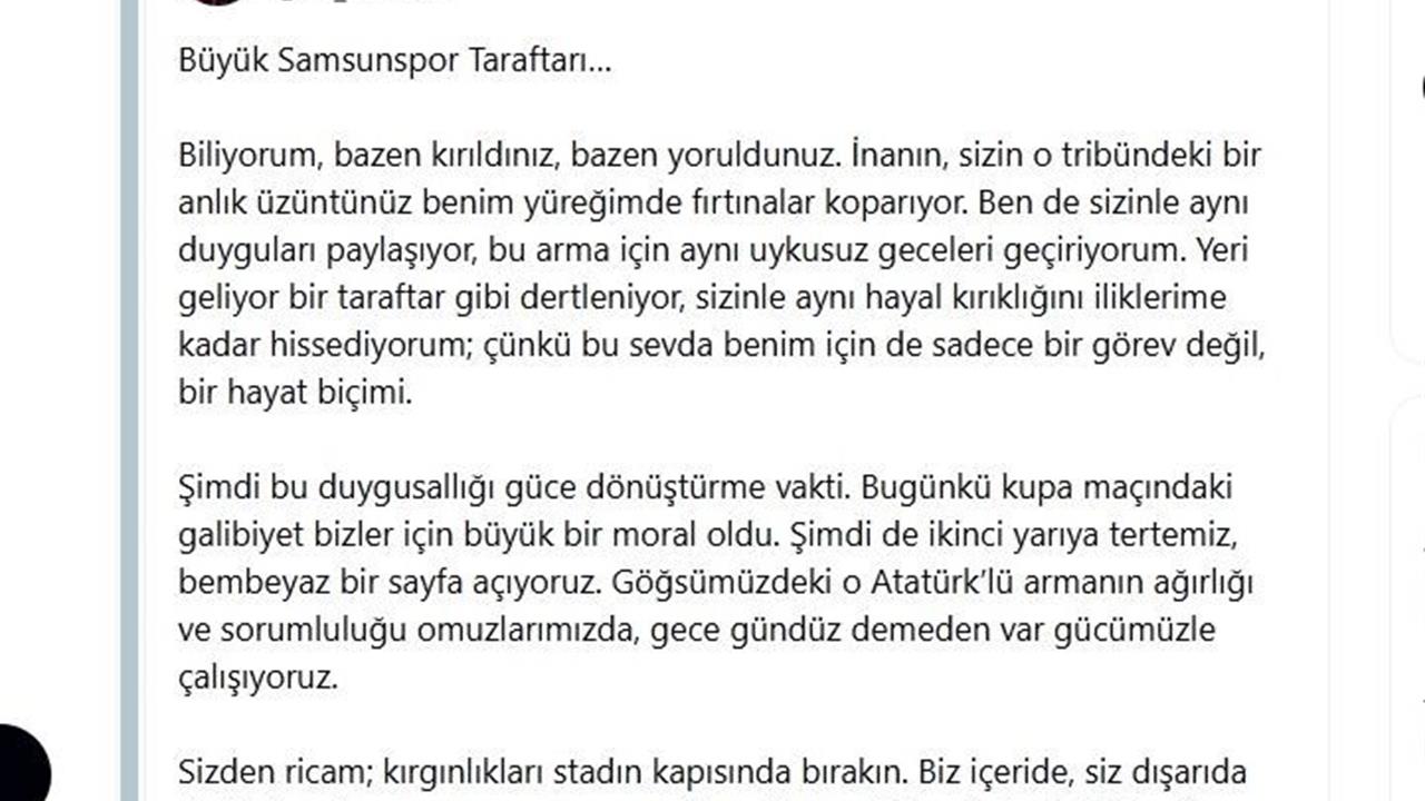 Samsun'da gerçekleştirilen bir etkinlikte, Yüksel Yıldırım taraftarlarla bir araya geldi. Burada yaptığı konuşmada, “Göğsümüzdeki o Atatürklü armanın ağırlığı ve sorumluluğu omuzlarımızda. Gece-gündüz demeden var gücümüzle çalışıyoruz. Sizden ricam; kırgınlıkları stadın kapısında bırakın” ifadelerini kullandı. Yıldırım, taraftarların desteği ile birlikte şehri ve armayı layık olduğu yere taşımak için birlik olmaları gerektiğini vurguladı. “Biz nasıl önceleri güçlü bir aile idiysek, şimdi de tekrar çok daha güçlü bir aile olduğumuzda önümüzde hiç kimse duramaz. Bu şehri ve bu şanlı armayı layık olduğu yere hep birlikte taşıyacağız. Birlikte başaracağız. Biz bize yeteriz” dedi. Başkan Yıldırım’ın bu sözleri, taraftarlar arasında büyük bir coşkuyla karşılandı ve paylaşımının altına birçok taraftar destek yorumları yaptı.