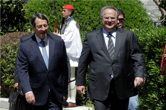 Yunanistan Dışişleri Bakanı Nikos Kotzias, bu sabah Rum Başkanlık Sarayı’nda, Rum Yönetimi Başkanı Nikos Anastasiadis’le bir araya geldi. Kotzias, "Kıbrıs’ın, iki bölgeli iki toplumlu cumhuriyet kurularak birleşmesini destekliyorum. Bunun olabilmesi için işgal ordularının çekilmesi şarttır. Son Türk askeri çekilene kadar da çözüm olmaz." dedi.