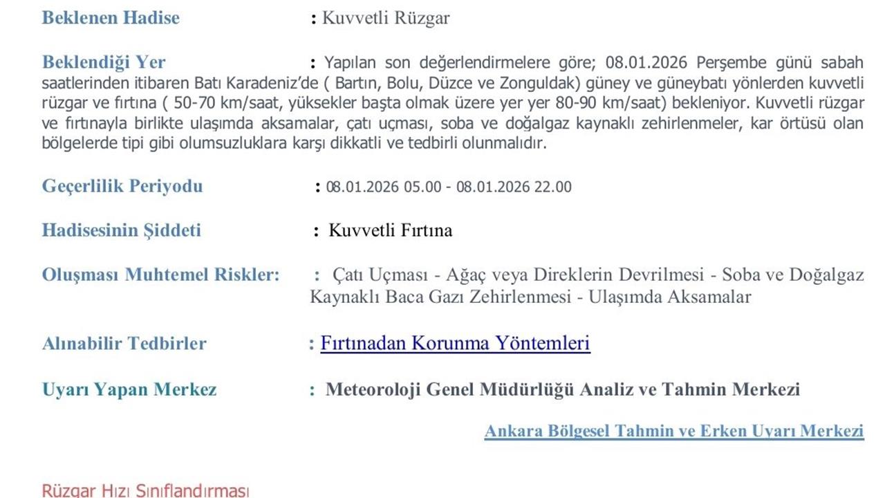Sabah saat 05.00'te başlayacak olan fırtınanın, gece 22.00'ye kadar devam etmesi bekleniyor. Meteoroloji, bu süreçte özellikle rüzgar ve fırtına nedeniyle çatıların uçabileceğini, ağaçların ve direklerin devrilebileceğini ifade etti. Vatandaşların soba ve doğalgaz kullanırken dikkatli olmaları gerektiği, zehirlenme vakalarının önlenmesi adına önemli bir uyarı olarak değerlendiriliyor.