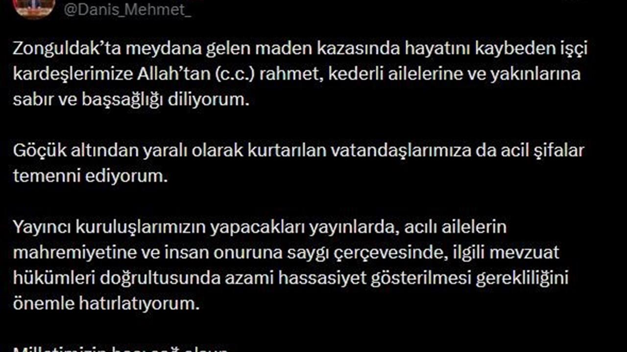Radyo ve Televizyon Üst Kurulu (RTÜK) Başkanı Mehmet Daniş, Zonguldak’ta meydana gelen maden kazası sonrasında sosyal medya hesabından bir açıklama yaptı. Açıklamasında, kazada hayatını kaybeden işçilere Allah’tan rahmet, kederli ailelerine ve yakınlarına sabır diledi. Aynı zamanda, göçük altından yaralı olarak kurtarılan vatandaşlara da acil şifalar temenni etti.