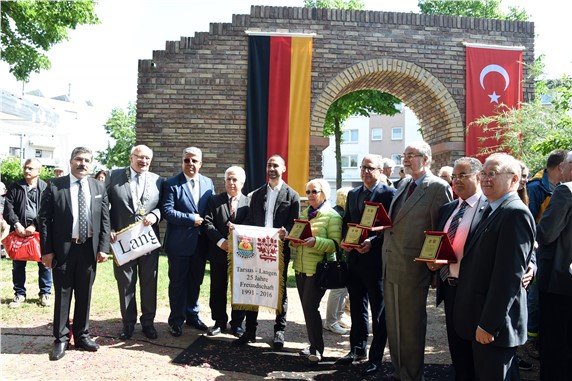 Tarsus heyeti, Langen Belediye Başkanı Gebhardt'a 25. yıl anısına özgün ipek işlemeli bir dostluk flaması armağan etti.