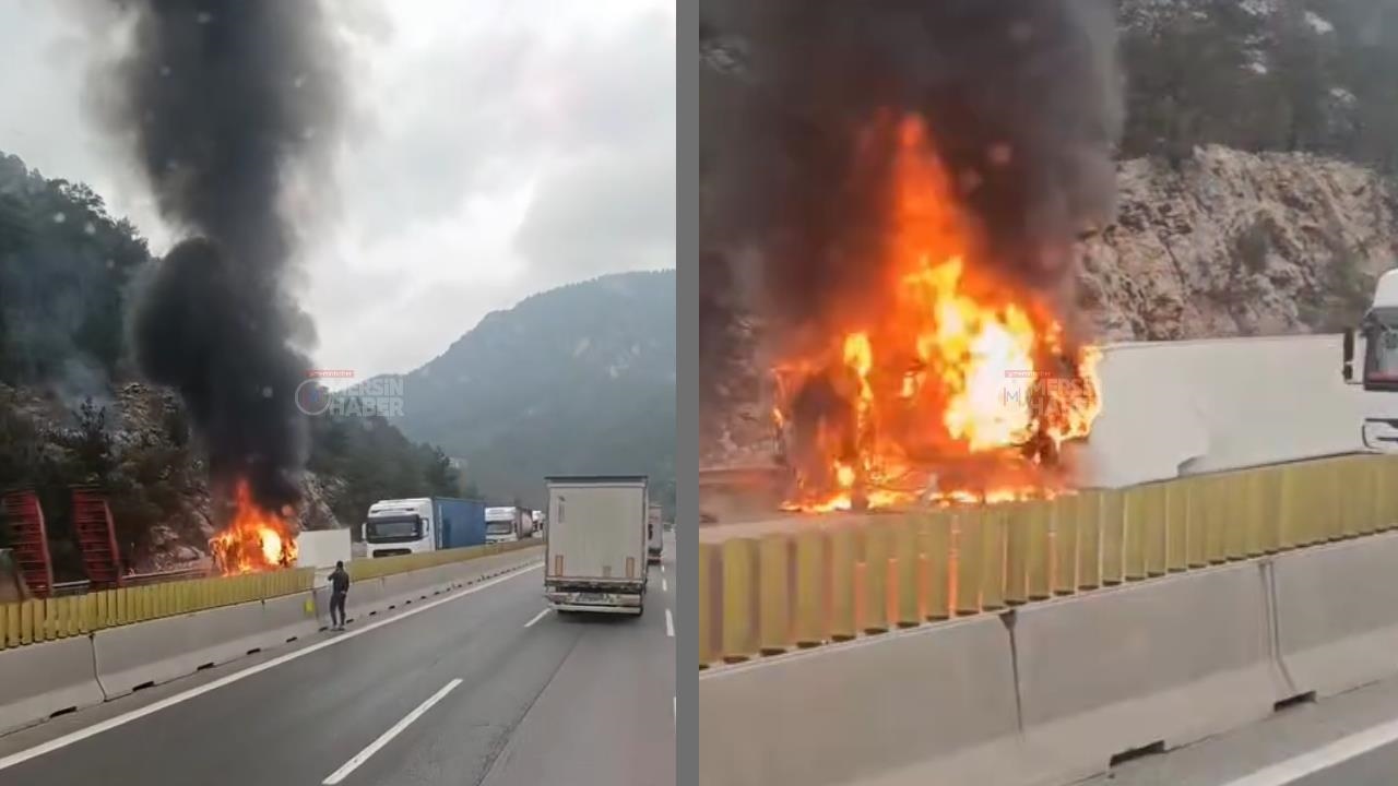 Mersin-Tarsus-Pozantı Otoyolu Gülek Geçidi mevkiinde seyir halindeki bir TIR'ın dorsesinde yangın çıktı. Alevlerin geceyi aydınlattığı olayda dorse saniyeler içinde demir yığınına döndü!