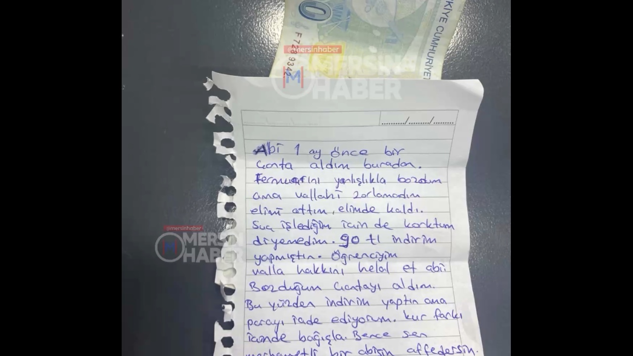 Mersin Akdeniz ilçesindeki Mesudiye Mahallesi'nde meydana gelen olay, bir öğrencinin duyarlılığı ile sosyal medyada gündem oldu. Bir ay önce dükkândan çanta alan öğrenci, fermuarının bozulmasından dolayı vicdan azabı çektiğini ifade ederek, 90 TL'lik indirim tutarını iade etti. Notunun yanında 100 TL bırakan öğrenci, kur farkını da göz önünde bulundurarak 'bağışla' ifadesini kullandı.